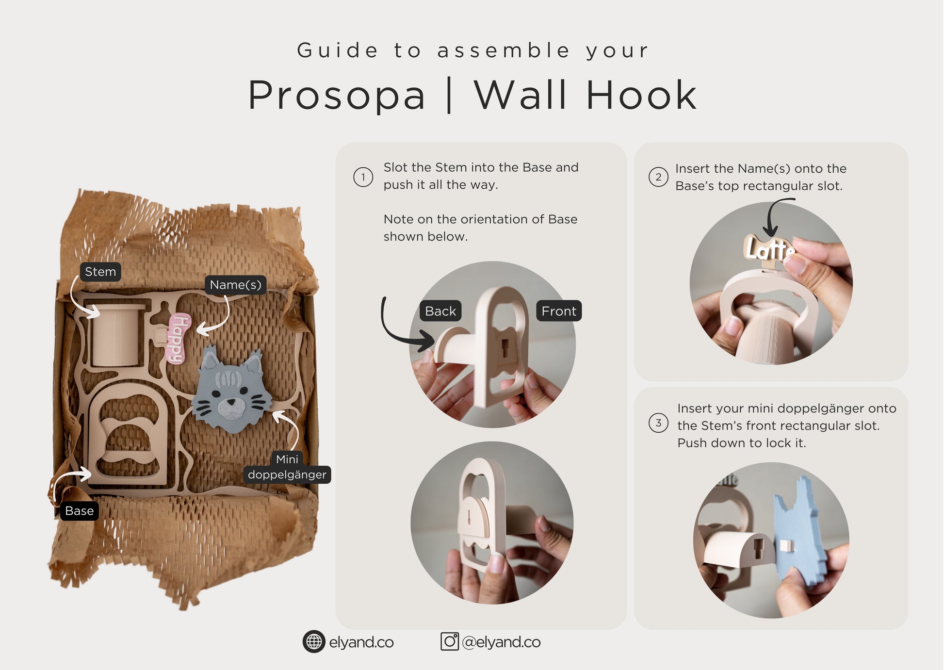 The Wall Hook Set includes a customised name, a Prosopa breed design, a base and a stem. If you are not able to find your furbabies mini doppelgänger in our Prosopa catalog, feel free to drop us a DM via our Instagram account @elyand.co or email us for further customisation.